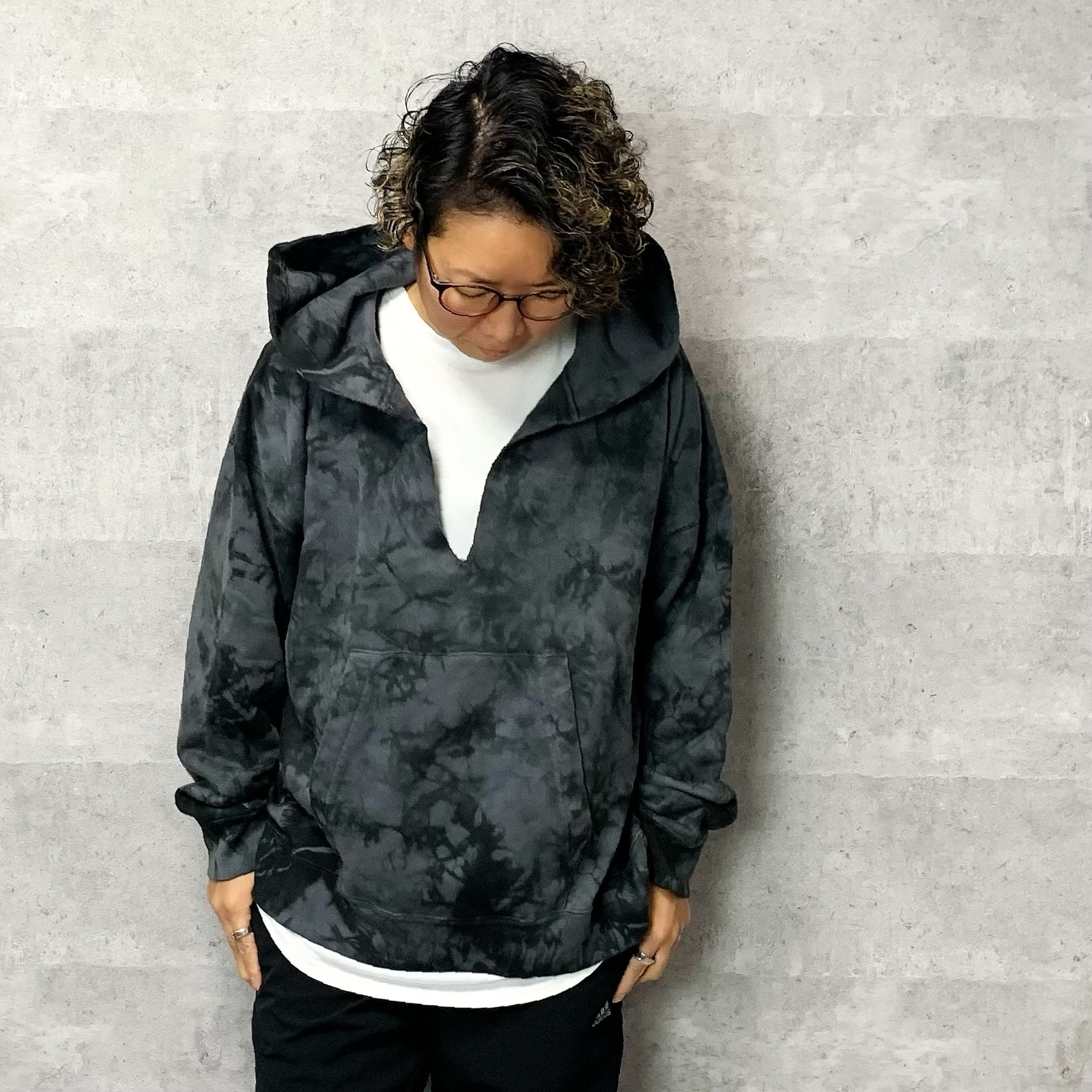 同トーンのタイダイに染めた裏毛パーカーの首元に切り込みを入れ、メキシカンパーカー風のデザインにアレンジ。